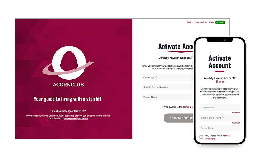 Enter your customer ID, which is located near the top of your stairlift order form. Type in your stairlift serial number found on the carriage underneath the seat. Finally, enter your postal code.